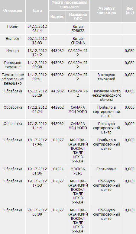 Сегодня протестил трекинг-номер и походу мои чоки с 06-03-2012 болтаются на таможне. Что то как то долго для доставки ЕМS. Думаю не просрали бы их в предпразничной суете. Вопрос к тем у кого посылку обратно возвращали в США - что выдавала отслеживалка USPS?По собственному опыту замечу, если штатовскую таможню прошла, то должна пройти и нашу, но что то как то медленно проходит или наша почта не занесла движение по трекигу!?--------Нашел посылочку, как оказалось я отслеживал номер декларации (походу неправильно перевел месагу), начин